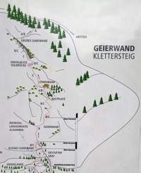 Der Geierwand-Klettersteig in Haiming am Fuße des Simmerings führt durch eine scheinbar glatte Felswand über 350 Meter steil hinauf. Die Gehzeit ist mit 2,5 Stunden angegeben. Doch ich hatte zwei Teilnehmer dabei, die fast keine Erfahrung mit Klettersteigen hatten. Die anderen hatten sich für Sportklettern an der Muttekopfhütte entschieden. Die Schwierigkeit ist mit B/C angegeben und die C-Stellen sind meist eher kurz. Schließlich haben wir 3,5 Stunden für den Steig gebraucht, was für Anfänger dennoch eine recht gute Zeit ist.