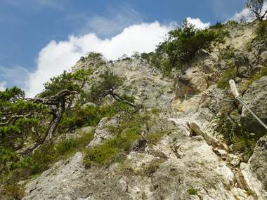 Über mehrere Stufen und kurze Gehstrecken führt der Steig teils über griffige Kanten, teils über glatte, aber gut mit Eisen versetzte Abschnitte, wird nie langweilig und überfordert unsere Klettersteig-Anfänger auch nicht. Der Steig ist aber mit seinen 350 zu überwindenden Höhenmetern recht lang und fordert daher sehr gute Kondition.