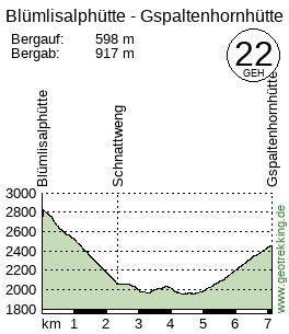 1200 Meter Abstieg gehen an sich schon ordentlich in die Beine, aber so steil ist es doppelt anstrengend. Besonders die ersten 800 Meter haben es in sich. Unterhalb des Hohtürli besteht Steinschlaggefahr und so sind wir froh, die letzten Absteiger an diesem Morgen zu sein. Kurz vor dem Schnattweng kommen uns die ersten Grüppchen keuchend von der Bundalp entgegen und sie tun uns leid. Ab Schnattweng wird es für uns entspannter: in leichtem Auf und Ab wandern wir Richtung Gamchigletscher oder was davon noch übrig ist. Die Gletscherquerung erfolgt ausschließlich auf gut markierter Schotterpiste, allerdings muss der Weg ständig erneuert werden, da die Gletscherbäche ständig neue Furchen graben. Der Gornerbach hat sich hier schon vor der Gletscherschmelze tief in die Felsen eingegraben, so dass nur über zwei Brücken die Überquerung möglich ist. Auf der anderen Seite geht es steil die Gletscherwange hoch und dann weiter über steile Kehren bis auf Höhe der Gspaltenhornhütte. Kurz vor der Hütte lädt ein Bächlein zum Erfrischen ein. Die Gspaltenhornhütte wirkt sehr modern. Die letzte Erweiterung erfolgte 2014. Jedoch wurde an den Toiletten gespart, so dass für 70(!) Gäste nur 2 Toiletten zur Verfügung stehen, was zu regelmäßgien Engpässen führt.
