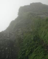 Bei Nebel und leichtem Niesel steigen wir aus dem Hochie-Tal. Der rot-weiß markierte Wanderweg wird an einer Steilstufe durch die Nässe zu einer rutschigen, ausgesetzten Partie am Stahlseil, bevor wir wieder festen Boden unter den Fußen spüren. Den Abzweig auf blau-weiß finden wir ohne Schwierigkeiten und der Pfad ist hervorragend markiert, so dass wir selbst im immer noch dichten Neben meist mehrere Markierungen im Voraus erkennen. Danke Herr von Känel, das war sehr gute Arbeit, nicht alle Wege sind so gut markiert!