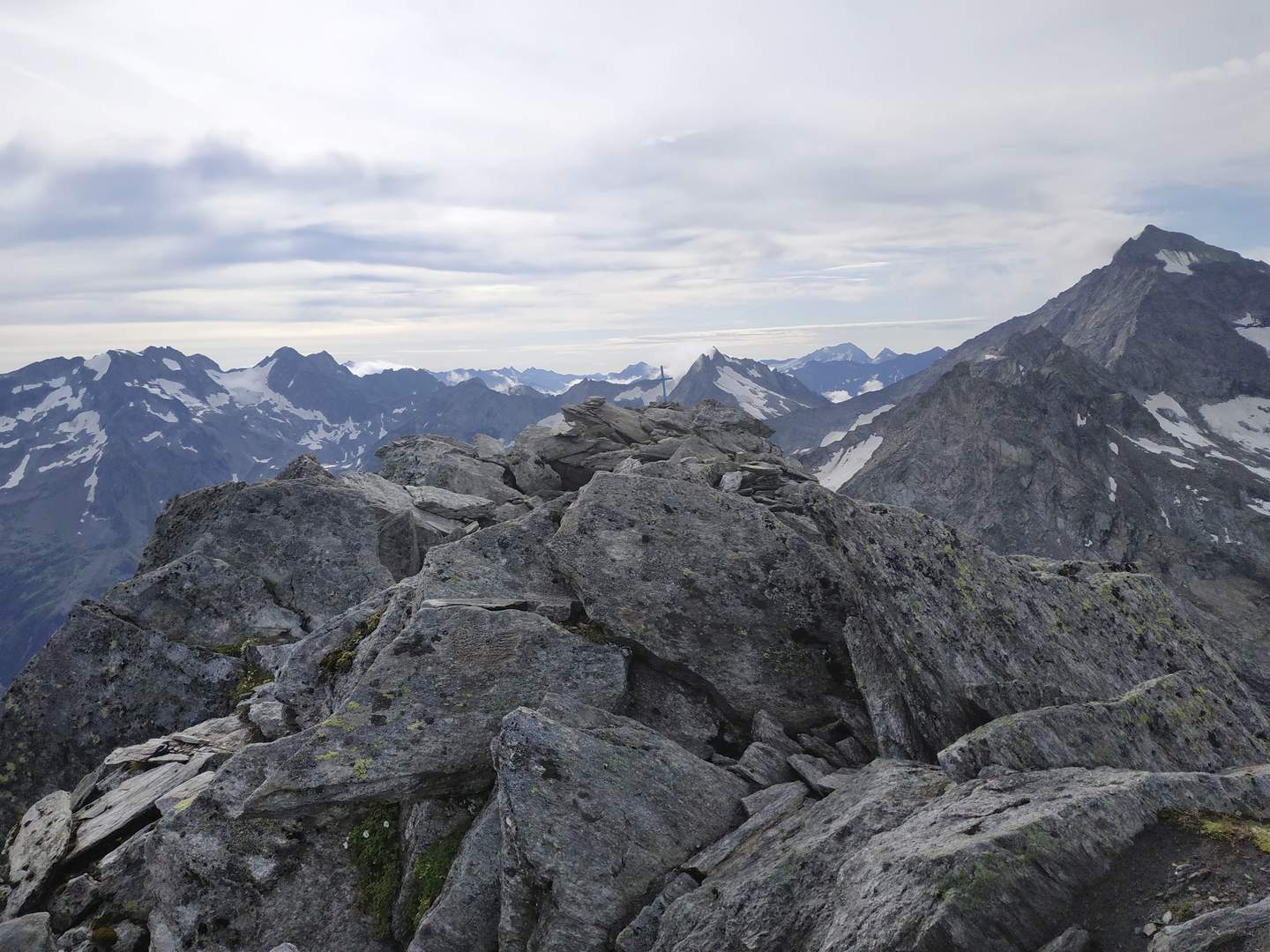 Zwischen Keilbachspitz (3093 m) und Großem Löffler (3378 m) schaut der Hochgall (3436 m) herüber.