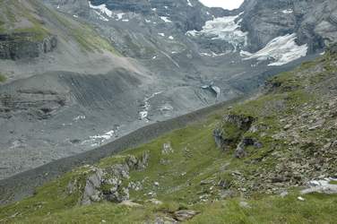 1200 Meter Abstieg gehen an sich schon ordentlich in die Beine, aber so steil ist es doppelt anstrengend. Besonders die ersten 800 Meter haben es in sich. Unterhalb des Hohtürli besteht Steinschlaggefahr und so sind wir froh, die letzten Absteiger an diesem Morgen zu sein. Kurz vor dem Schnattweng kommen uns die ersten Grüppchen keuchend von der Bundalp entgegen und sie tun uns leid. Ab Schnattweng wird es für uns entspannter: in leichtem Auf und Ab wandern wir Richtung Gamchigletscher oder was davon noch übrig ist. Die Gletscherquerung erfolgt ausschließlich auf gut markierter Schotterpiste, allerdings muss der Weg ständig erneuert werden, da die Gletscherbäche ständig neue Furchen graben. Der Gornerbach hat sich hier schon vor der Gletscherschmelze tief in die Felsen eingegraben, so dass nur über zwei Brücken die Überquerung möglich ist. Auf der anderen Seite geht es steil die Gletscherwange hoch und dann weiter über steile Kehren bis auf Höhe der Gspaltenhornhütte. Kurz vor der Hütte lädt ein Bächlein zum Erfrischen ein. Die Gspaltenhornhütte wirkt sehr modern. Die letzte Erweiterung erfolgte 2014. Jedoch wurde an den Toiletten gespart, so dass für 70(!) Gäste nur 2 Toiletten zur Verfügung stehen, was zu regelmäßgien Engpässen führt.
