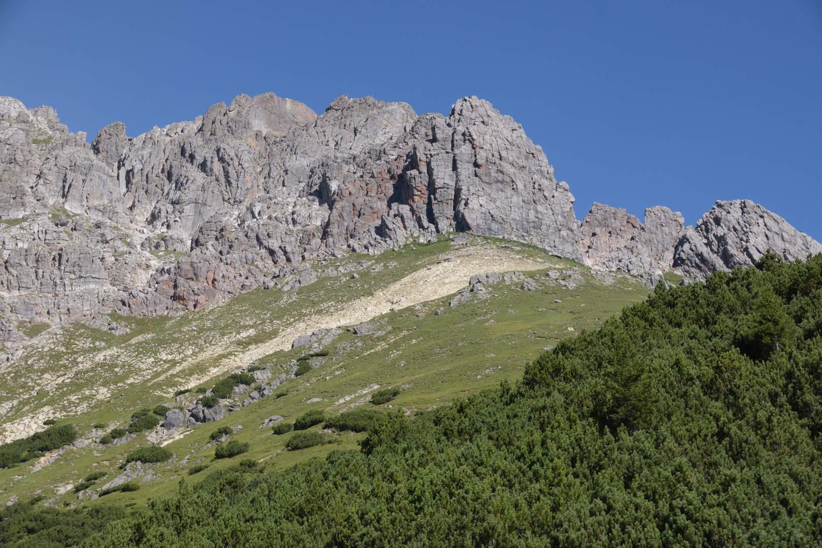 Vom Plattigsteig kann man die Vordere Platteinspitze (2562 m, Bildmitte) schon gut erkennen.