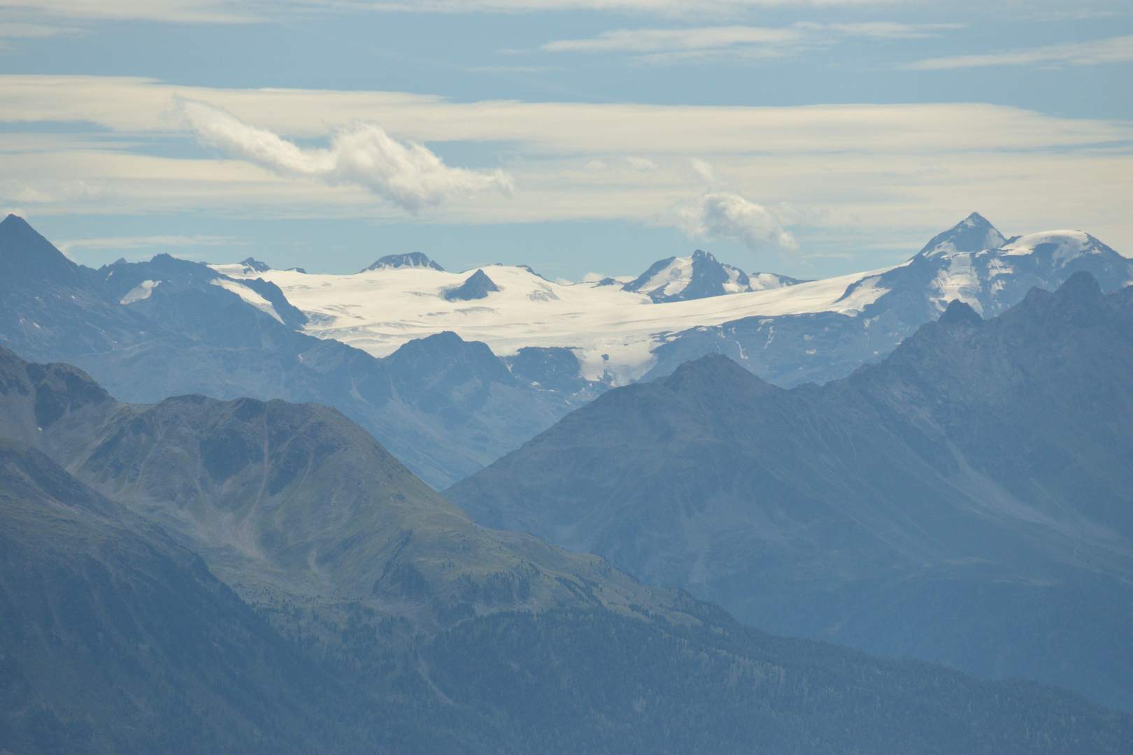 Der Gepatschferner, mit 18 km² die größte zusammenhängende Gletscherfläche Österreichs. Weiter hinten und rechts der Bildmitte schaut die Weißkugel (3738 m) darüber. Am rechten Bildrand nur scheinbar höher die Weißseespitze (3510 m).