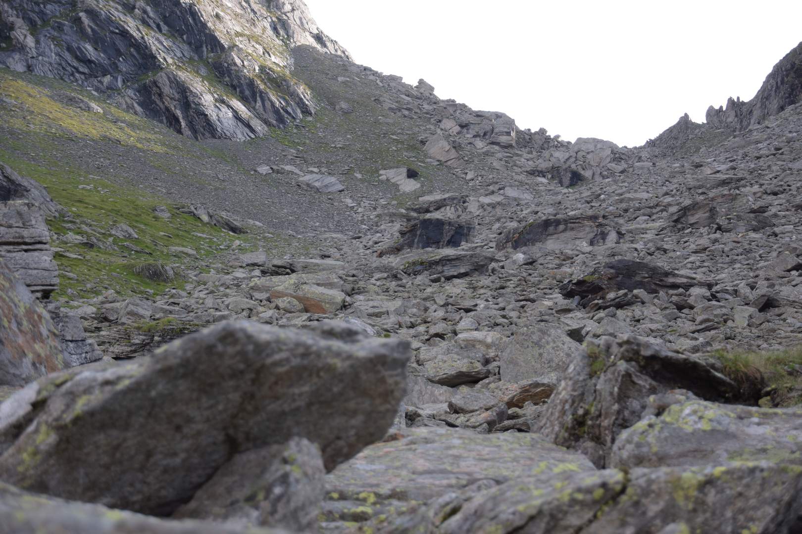 Lapenscharte in Sicht! Der Weg führt links über die grasige Halde.
