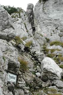 Vom Petersköpfel zeigt sich schon die Pyramiedenspitze - unser heutiger Gipfel. Bis dahin sind es zwar nur noch einige hundert Meter, die sind allerdings mit vielen Stufen und Steinen sowie quer über den Weg liegenden oder besser gesagt fliegenden Wurzeln ausgestattet, so dass an ein schnelles Vorankommen nicht zu denken ist. Schließlich gilt es, am Vogelbad einen kleinen Klettersteig abzusteigen, eine Ausrüstung ist hier meiner Meinung nach nicht erforderlich.