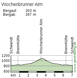Wir starten in Schwendt und durchstreifen die Gärten mit ihren Obstbäumen, bis wir auf den Fahrweg zur Wochenbrunner Alm kommen, dem wir bis zur Mautstelle folgen. Von hier führt ein steiler Bergpfad neben dem Fahrweg, vorbei an einer Kapelle, hinauf zur Alm.