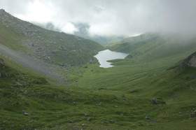 Der Weg ist steinig, erweist sich aber trotz der Nässe nicht als besonders rutschig. Dennoch muss jeder Schritt etwas vorsichtiger gesetzt werden und einige ausgesetzte Stellen mit Bedacht begangen werden. Von den Bergen sehen wir so gut wie nichts. Als der Partunsee plötzlich unter uns aus dem Nichts auftaucht, sind wir schon fast an ihm vorbei. Die kurzen Regenpausen gestatten lediglich, die Kleidung der Temperatur anzupassen oder einen Riegel zu mampfen.