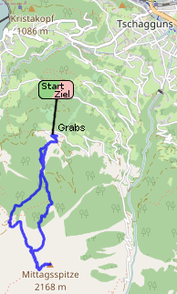 Gäste vom Berghof Grabs können ihr Auto auf dem Parkplatz daneben parken. Da wir ohnehin dort Mittagessen wollen, stellen wir gegen 8 Uhr unser Auto am Berghof ab und steigen Richtung Mittagsspitzgrat auf. Über dem Hochjoch und dem Zimba blitzt und rumpelt es. Da kommt uns ein kleines Kontrollhäuschen am oberen Ende des Schie-Liftes wie gerufen. Als das Gewitter vom Zimba zu uns herüber kommt und es zu regnen anfängt, stellen wir uns in dem Häuschen unter und warten fast eine Stunde, bevor das Gewitter vorüber ist. Wir überlegen noch, ob wir nicht abbrechen, doch die Wetterprognose ist gut. So steigen wir weiter auf und wollen erst mal über die Bäume schauen, ob da noch mehr kommt.