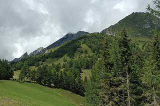 Auch die Wiesen oberhalb der Wodenalm laden zum Wandern ein. So wäre ein Aufstieg zum Planlisbichl sehr reizvoll. Jedoch brauen sich schon dunkle Regenwolken zusammen, so dass wir nach einer Mittagsrast in der Wodenalm den kürzesten Weg zurück zu unserem Auto wählen.