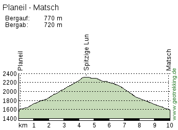 Auch heute verspricht der Vinschgauer Höhenweg hauptsächlich Fahrwege und Straßen. Darauf haben wir keine Lust. Außerdem ist bestes Wetter angesagt, so dass wir der Alternative zur 2. Etappe folgen. Auf einem steilen Waldweg gelangen wir in ca. drei Stunden zur 800 Meter höher gelegenen Spitzigen Lun, einem Vorgipfel des Bergrückens, der von der Weißkugel kommend das Planeiltal vom Matschertal trennt. Die unscheinbare runde Kuppe bietet jedoch einen herrlichem Ausblick über den oberen Vinschgau: Orgelspitze, Tschengelser Hochwand, Ortler, Sesvenna bis zum Reschensee.