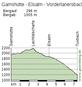 Von der Gamshütte geht es leicht bergauf bis zu den Ausläufern des Spitzeggs, wo es etwas felsig wird. Im Ganzen ist der Weg aber nicht anstrengend. Am Lachtalspitz geht es vorbei, durch die Lachtalscharte hindurch. Danach ein Stückchen Heideland, bis wir schließlich auf der Elsalm ankommen. Wer hier noch gut bei Kräften ist, kann auch über das Trettensjoch nach Lanersbach laufen. Wir wählen den direkten, sehr steilen Abstieg durch das Elsegg.